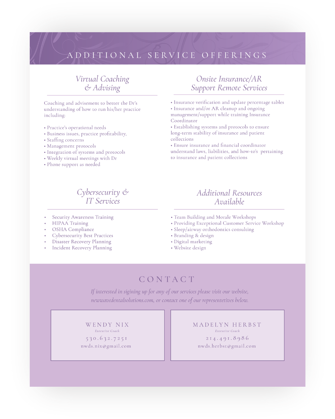Since New Wave was an established business, my objective was to update their branding to be more modern while incorporating the owner’s preferred aesthetic into the design. The main challenge was selecting content that complemented our chosen purple color palette. I ultimately incorporated a significant amount of whites and silvers to ensure the purple remained prominent and impactful without overwhelming the overall design. In the end, we combined imagery of office environments, business professionals, and team-building activities with soft floral elements and elegant swirls, highlighting the brand’s feminine touch while communicating professionalism and success.
